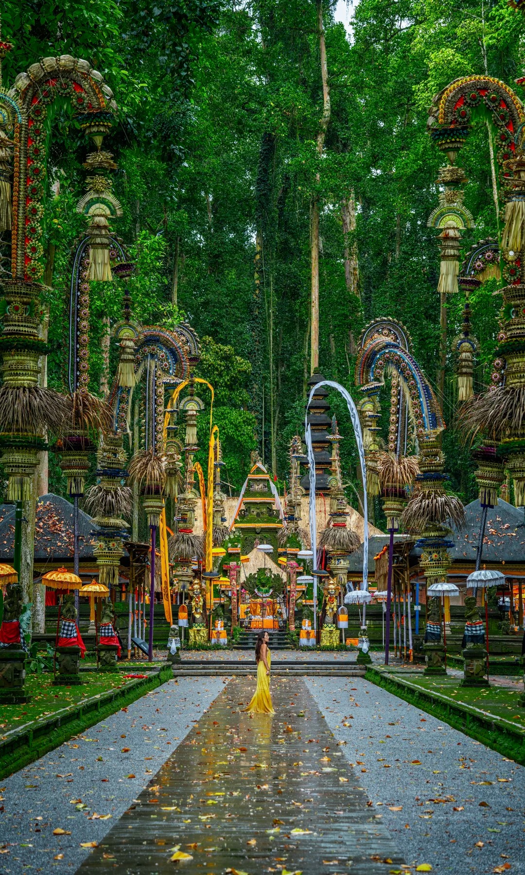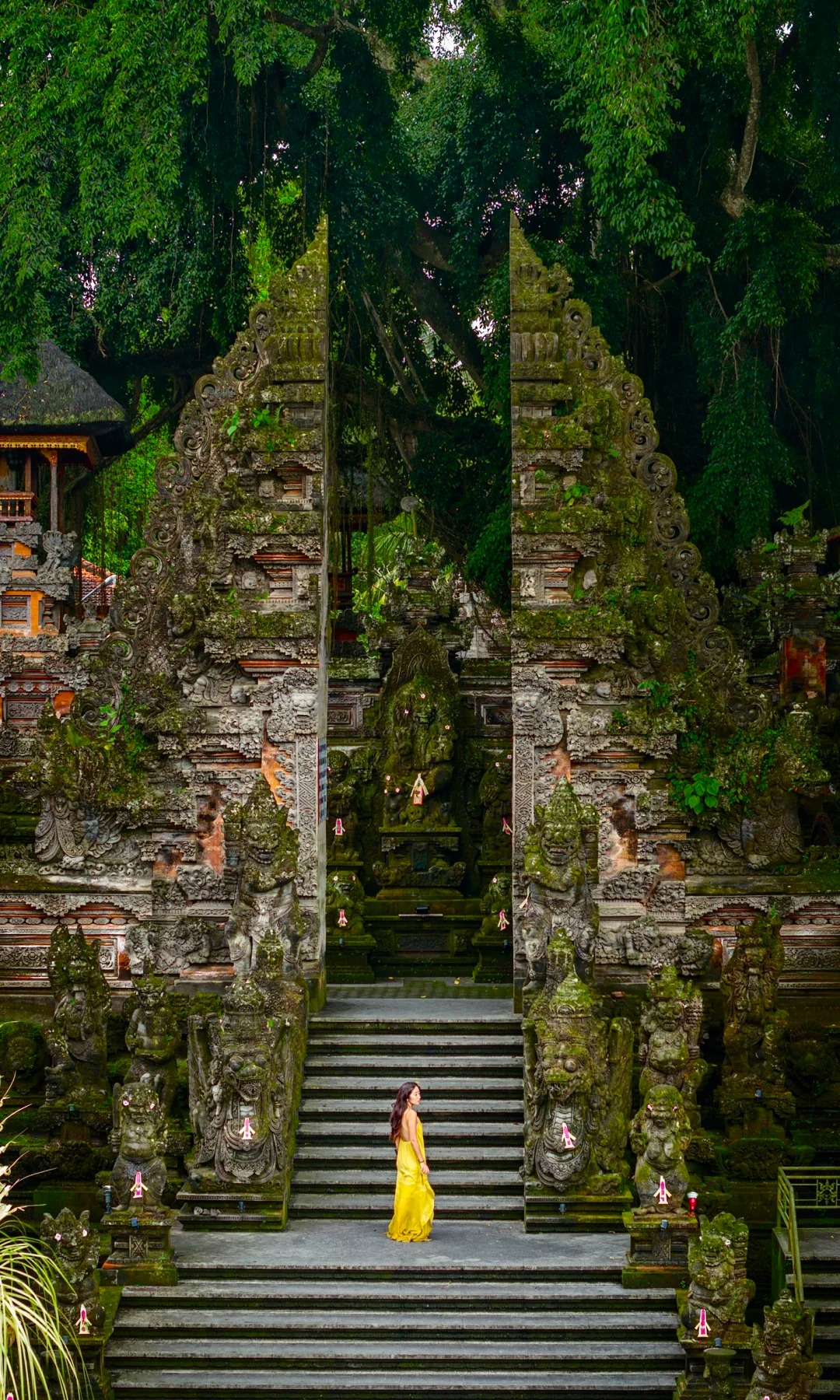 【乌布皇宫】(约 30 分钟)坐落在素有“巴厘岛艺术重镇”之称的乌布,这栋在 16 世纪建成的宫殿气势恢宏,尤其是 外观精美的石刻艺术,堪称一绝。当时政府规定所有建筑的高度不得高于椰子树,皇宫也不例外,因此这座建筑并不高。远 远看去,宫殿的大门像一座塔形的牌坊,虽称不上华丽,但足以让人过目不忘。这座宫殿是乌布王朝请了当时著名的艺术家 设计而成的,光是殿内精致细腻的手工雕刻就值得仔细欣赏一番。随处可见的金箔装饰贵气逼人,让整个气氛更显辉煌。如 此精致的皇室建筑,吸引了许多艺术爱好者慕名前来参观。