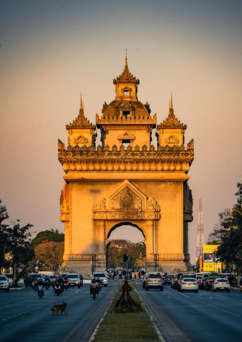 【凯旋门】老挝一座大型的纪念碑,六十年代末中国政府捐资1000万人民币帮助老挝政府重新修缮了凯旋门及广场,使它成为今天开放式公园,这也见证着中老两国的友谊。