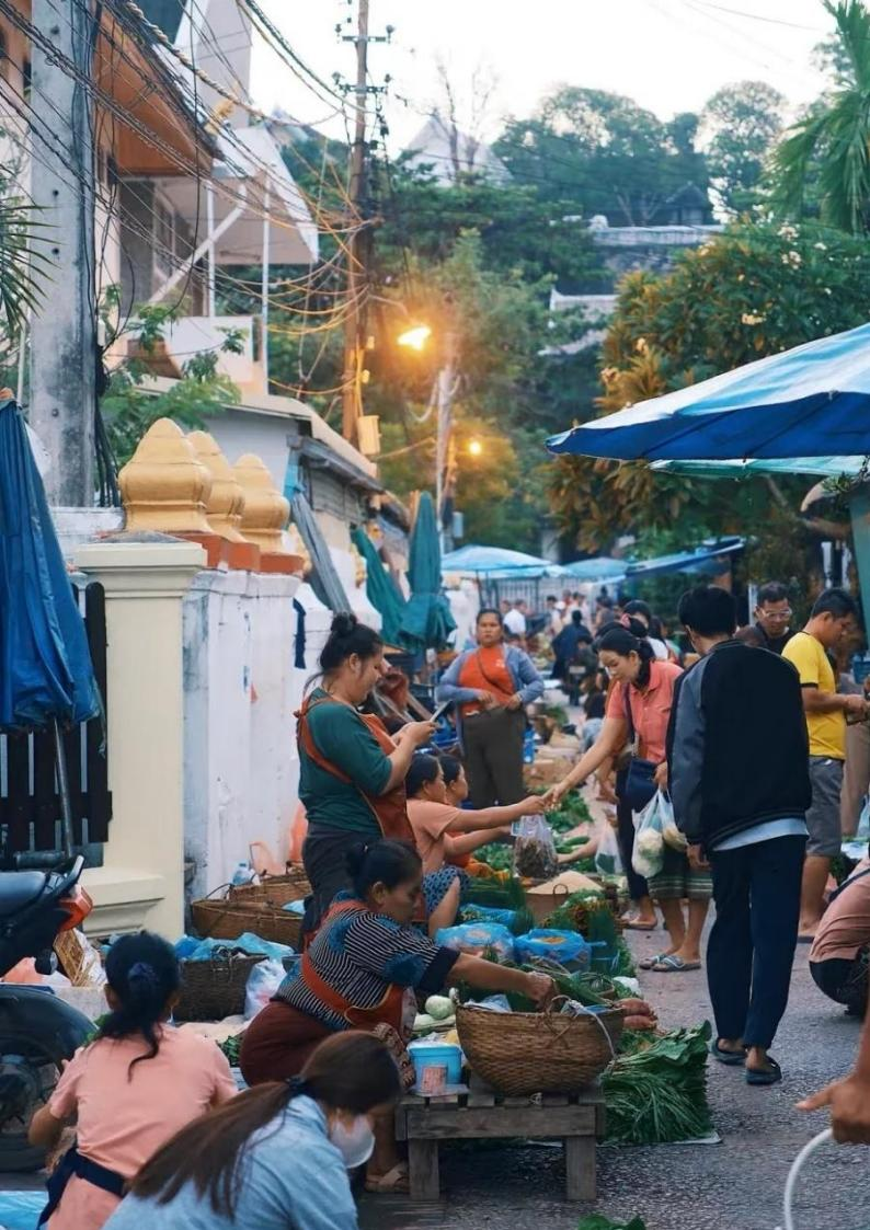 【早市】可寻得各种奇珍异宝,感受琅勃拉邦这座小城的热闹。早市位于洋人街旁,因为老挝特殊的地理位置和当地人的饮食习惯,在这里经常可以看到江鱼、鸟类、麂子、野猪、松鼠、乌龟、甲虫等老挝人特有的健康生态食材。