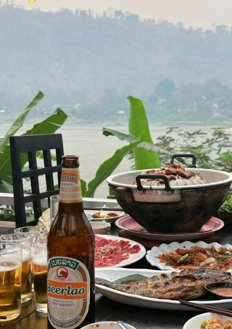 乘坐长尾船:南松河河水清澈见底,河两岸随处都可以看见茅草编制的小木屋供人喝酒用,河面戏水、唱歌、捕鱼、捞河苔,也能碰到法郎坐的轮胎救生圈漂在河面手里拿着Beerlao啤酒,享受老挝慢节奏生活。